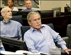 Today was the absolute first time I’ve seen Bush with big bags under his eyes. You know how presidents always seem to age under the burden? Not Bush… he’s always fresh as a daisy. It’s funny to see him struggling to be a hero when so many people just roll their eyes at his posturing.