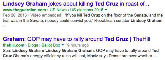 That’s all the time that separates Lindsey Graham joking at the Washington press club foundation dinner on Thursday night that “If you kill Ted Cruz on the floor of the Senate, and the trial was in the Senate, nobody could convict you,” and declaring on CBS last night that “we may be in a position where we have to rally around Ted Cruz as the only way to stop Donald Trump.”
