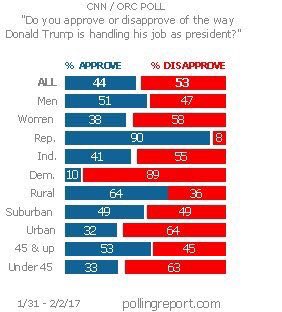 Trump is still rated favorably by 90% of Republicans. For comparison, Bush was at 60% approval among Republicans at his 28%. Hopefully this trend continues right up to 2018: