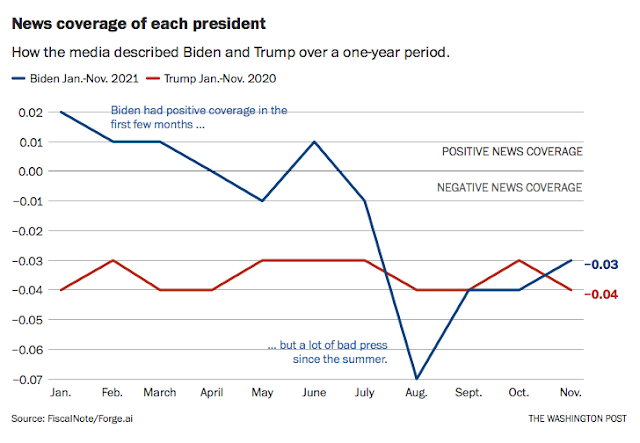 Washington Post columnist Dana Milbank had the impression that news coverage of President Biden had been “unrelentingly negative.” He wondered if it was just his imagination. So he worked with a team of data analysts to compare the coverage of Biden’s first 11 months of 2021 to the coverage Trump got during the first 11 months of 2020. Here’s what they found: